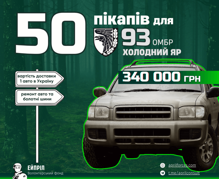 Збираємо 17 500 000 грн на закупівлю 50-ти автомобілів типу пікап для 93-ї ОМБр “Холодний Яр”. Вартість одного авто (+ доставка в Україну, ремонт і техобслуговування перед відправкою на фронт) – 340 000 грн