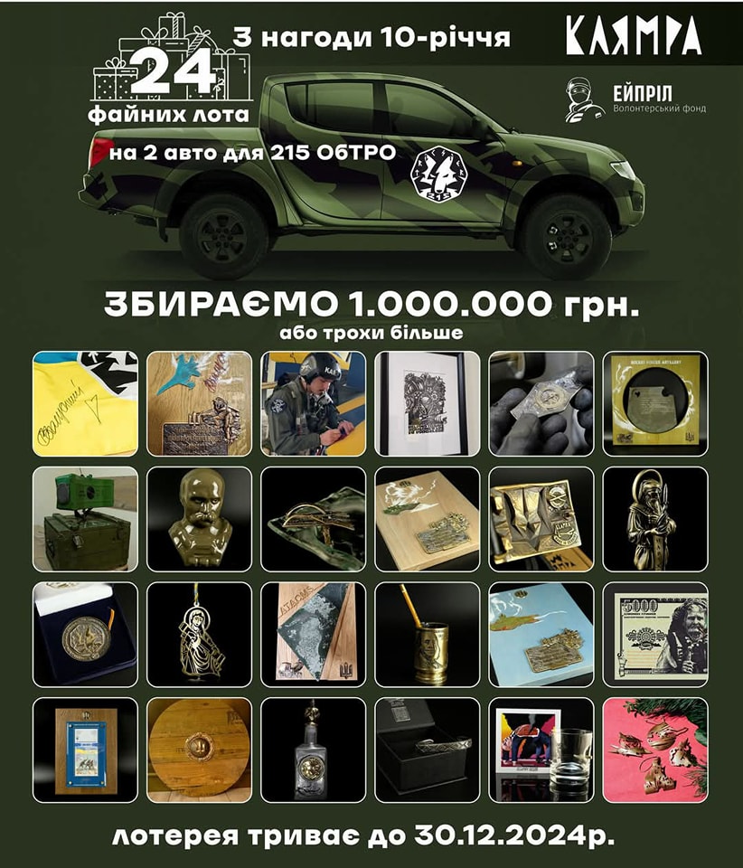 У наших друзів з Клямра – важливий ювілей. 10 років !“На жаль, так співпало, що 10 років з заснування Клямри триває війна з московією. Тому, ми в цей день, зібравши 24 файнезних лоти, за підтримки фонду “Ейпріл” організовуємо лотерею для збору коштів на купівлю двох піка...